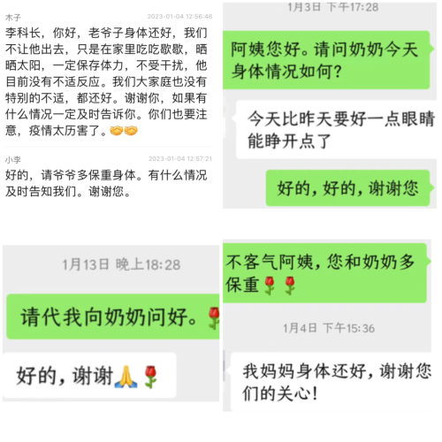 自2022年12月中旬以来,我们全天候保持电话畅通,几乎每天都会挨家挨户问候,通过电话、微信等方式与幸存者家属保持联系。了解老人身体状况、有无防疫用品等,动态掌握健康信息。截至目前,累计询访幸存者及家属437次。