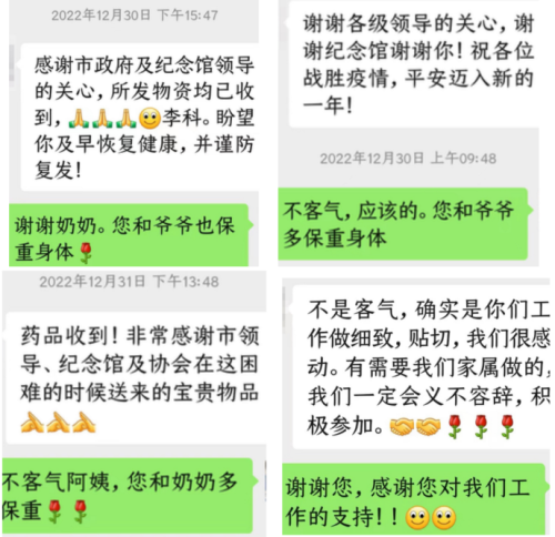 “向纪念馆表达最衷心的感谢!谢谢你们关照、询问我父亲的病情,谢谢你们帮忙联系医院,开通就医绿色通道,父亲转入呼吸科病房。经过10多天的精心救治,父亲的病情大为好转,他的心情也好了起来,能吃得下去。我们家属也期待父亲早日出院,回家静养! ”