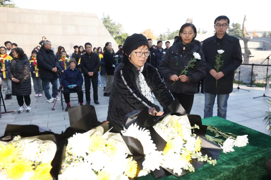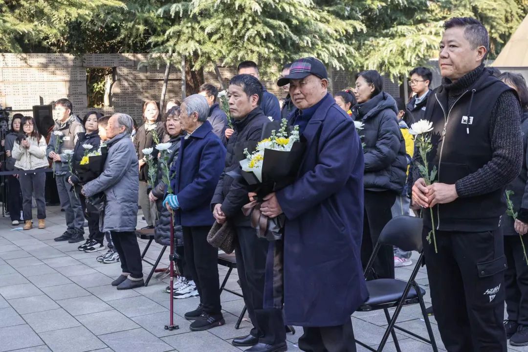 南京大屠杀幸存者艾义英、夏淑琴、刘民生手捧鲜花,在家人的搀扶下来到“哭墙”前,再一次为逝去的亲人送上鲜花和哀思。