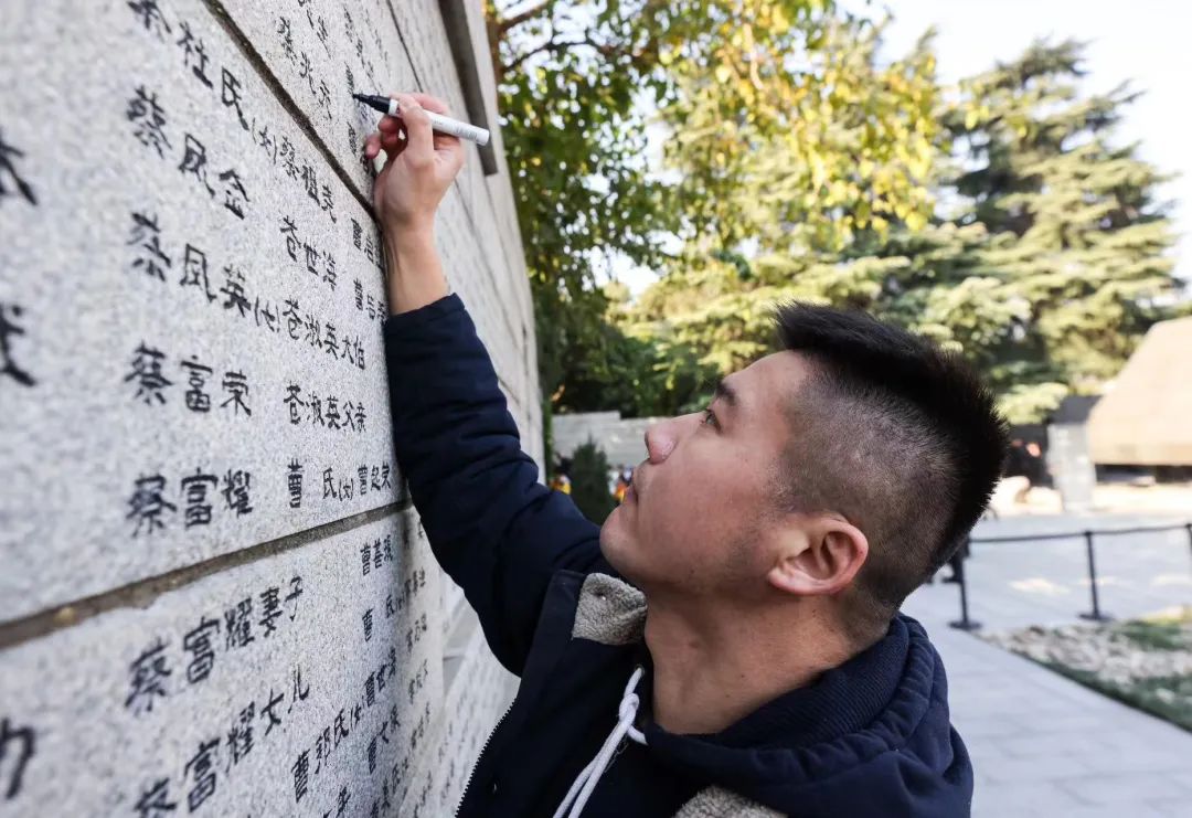 在祭奠的人群中,年轻身影越来越多。幸存者后代代表、学生代表等为南京大屠杀遇难者名单墙上的名字逐—“描新”,寄托哀思。