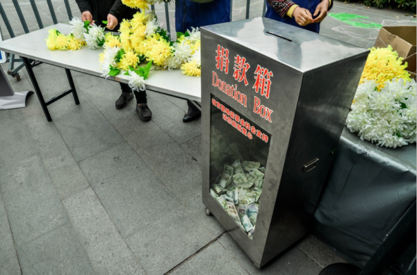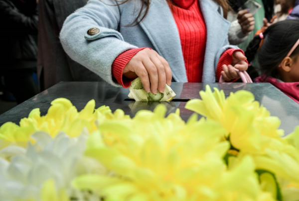 募捐活动将一直进行下去,下次来参观的你,会捐一点钱领一枝花,献出自己的一份爱心、表达你的悼念之情吗?