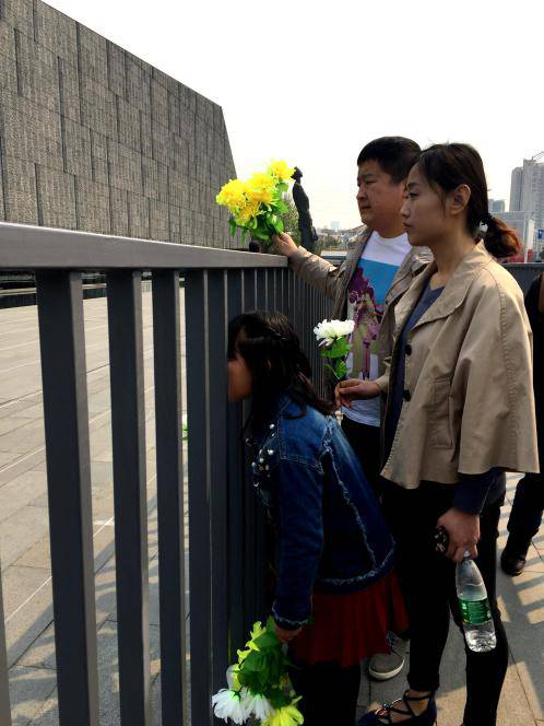 王艳松说:“作为南京人,对南京大屠杀这段历史感触更深。做了母亲,想起孩子,我更觉得我们应该珍惜现在的和平生活。我和孩子要把这枝花献给遇难者,希望逝者能够安息。”
