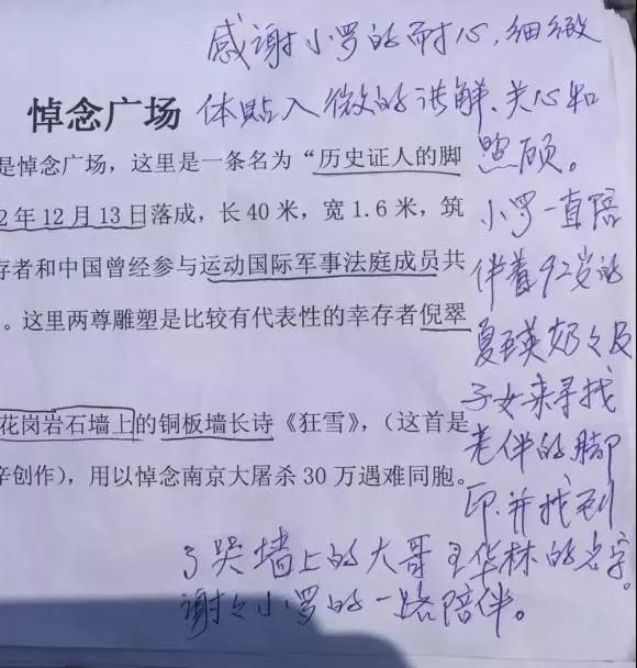 今年3月,志愿者小罗在讲解时遇到了夏至英老人。在小罗的陪伴下,老人在“历史证人的脚印”铜板路上找到了丈夫王华治的脚印,在遇难同胞名单墙上找到了大哥王华林的名字。夏老的女儿在参观结束后特地给志愿者留下了一张字条。