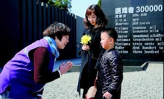 2019年3月,吉川淳子(左)在纪念馆向参观者进行讲解 新华社记者 季春鹏 摄