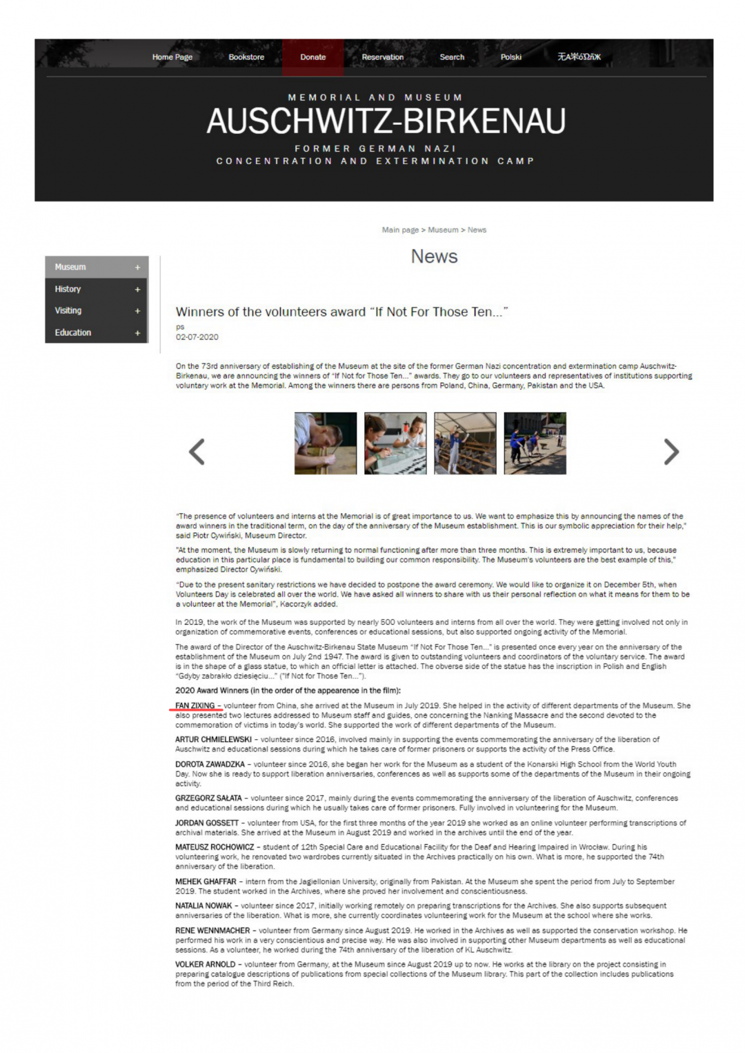 去年7月,奥斯维辛集中营纪念馆进行2019年度人物表彰时,范梓幸成为奥馆十大感谢人物之一,在奥馆的官网平台上发布了她的视频与寄语。