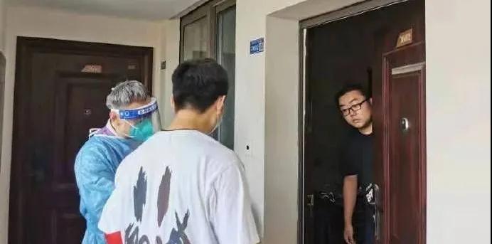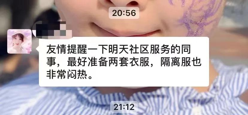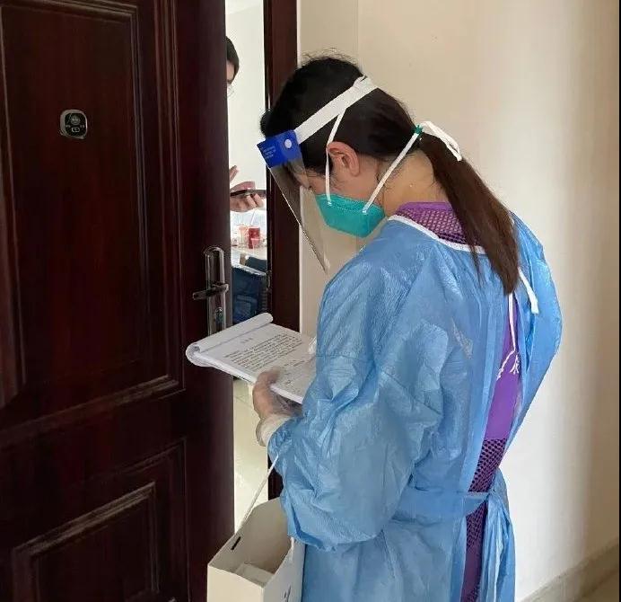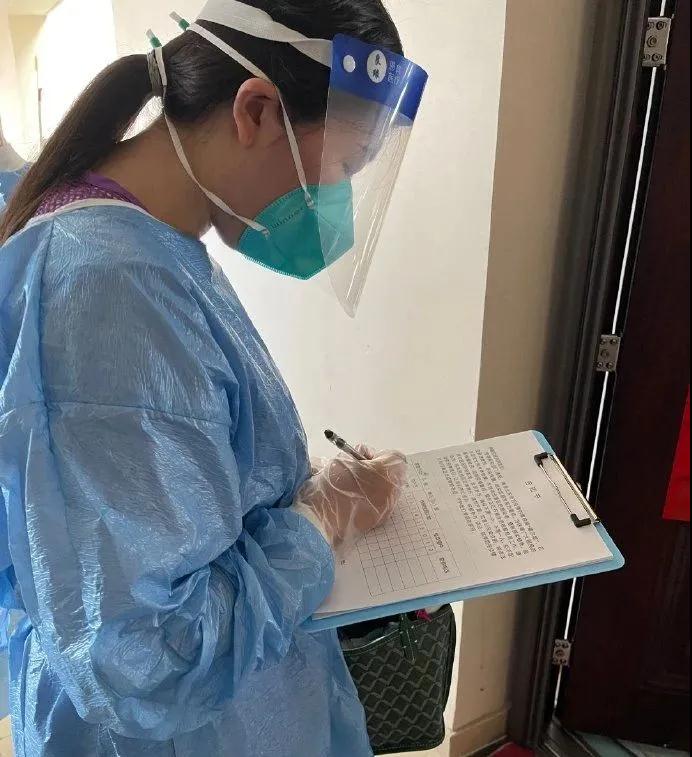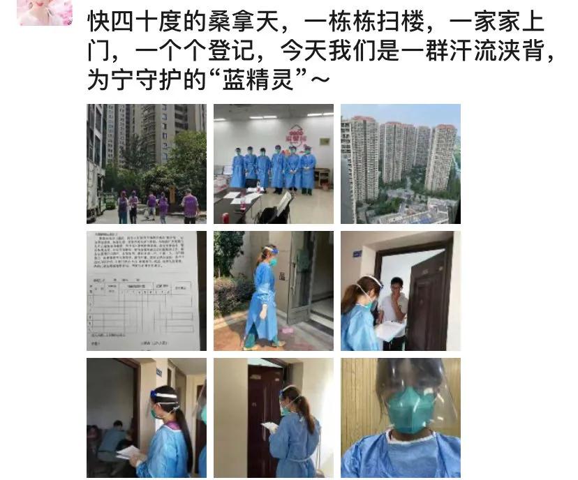 第二班的队员虽然没在阳光下暴晒,但楼道内不通风,温度也高达40℃,每户的登记时间平均下来要五分钟左右。穿着隔离衣的他们浑身湿透但依旧精神饱满,队员王晓阳就戏称自己是“为宁守护的'蓝精灵'”。