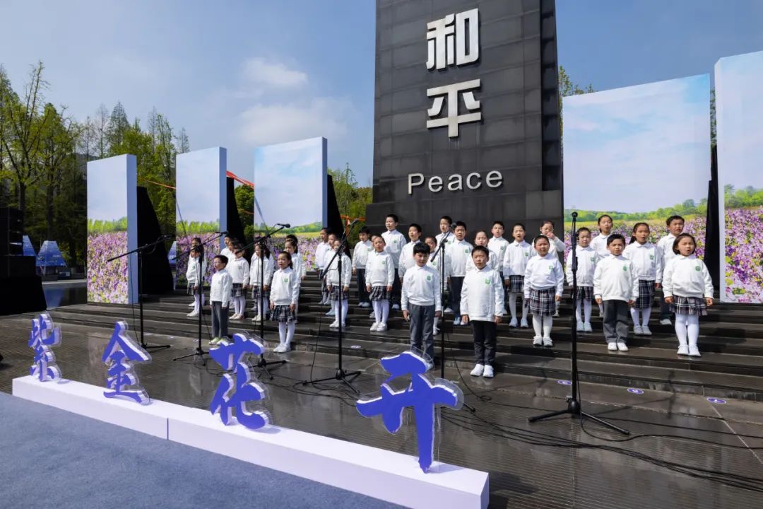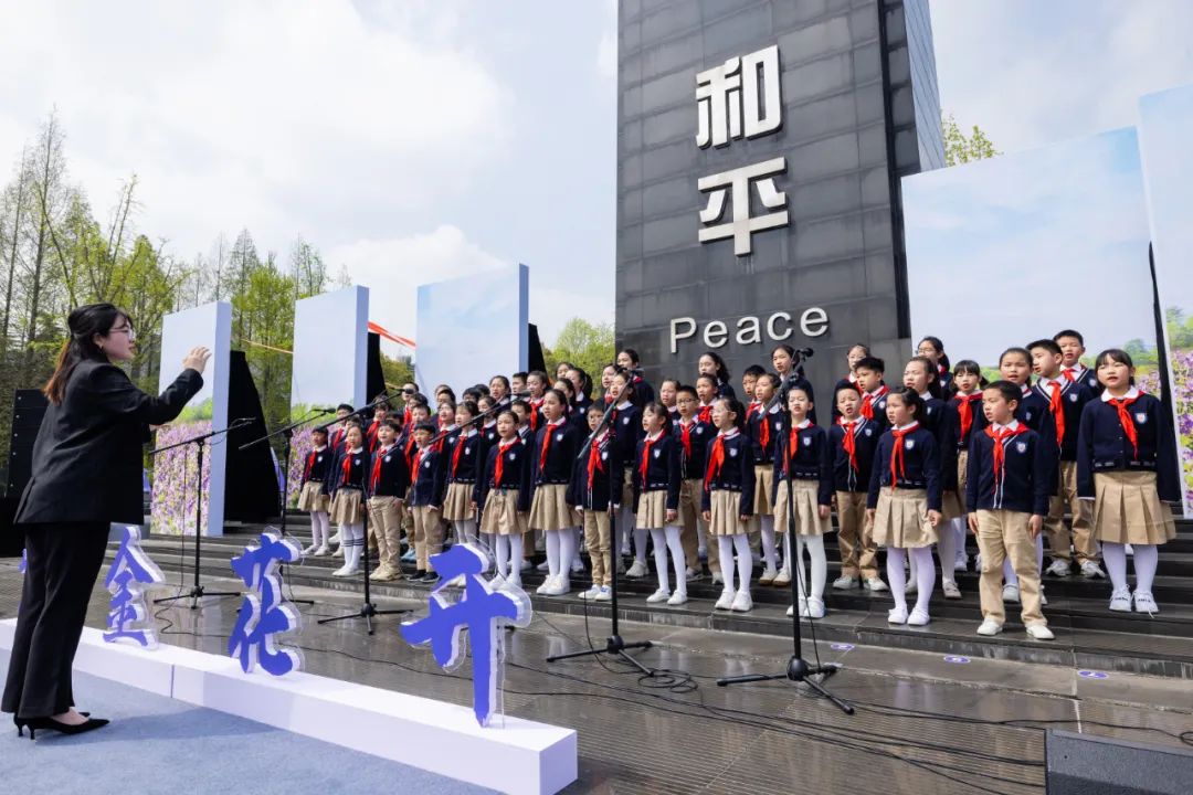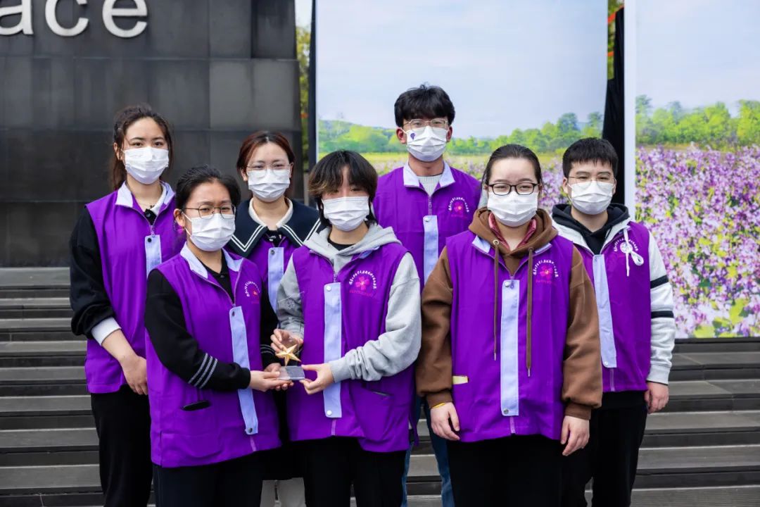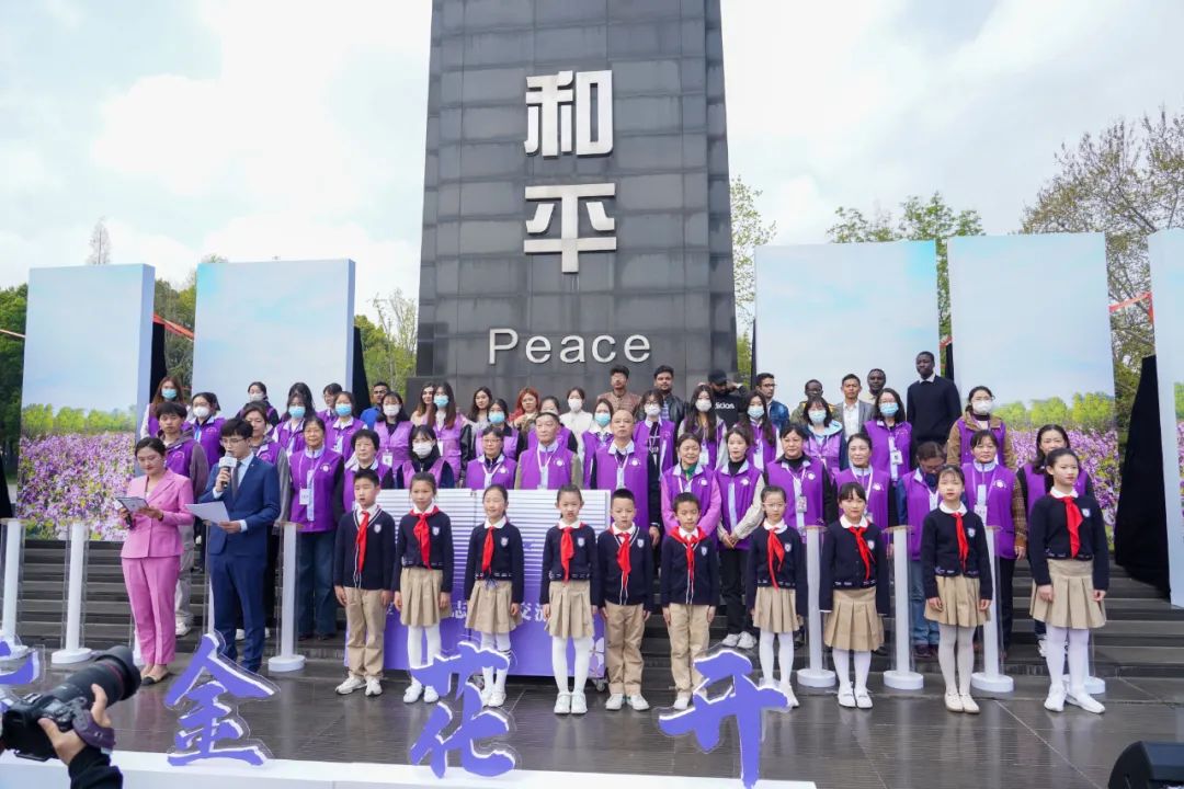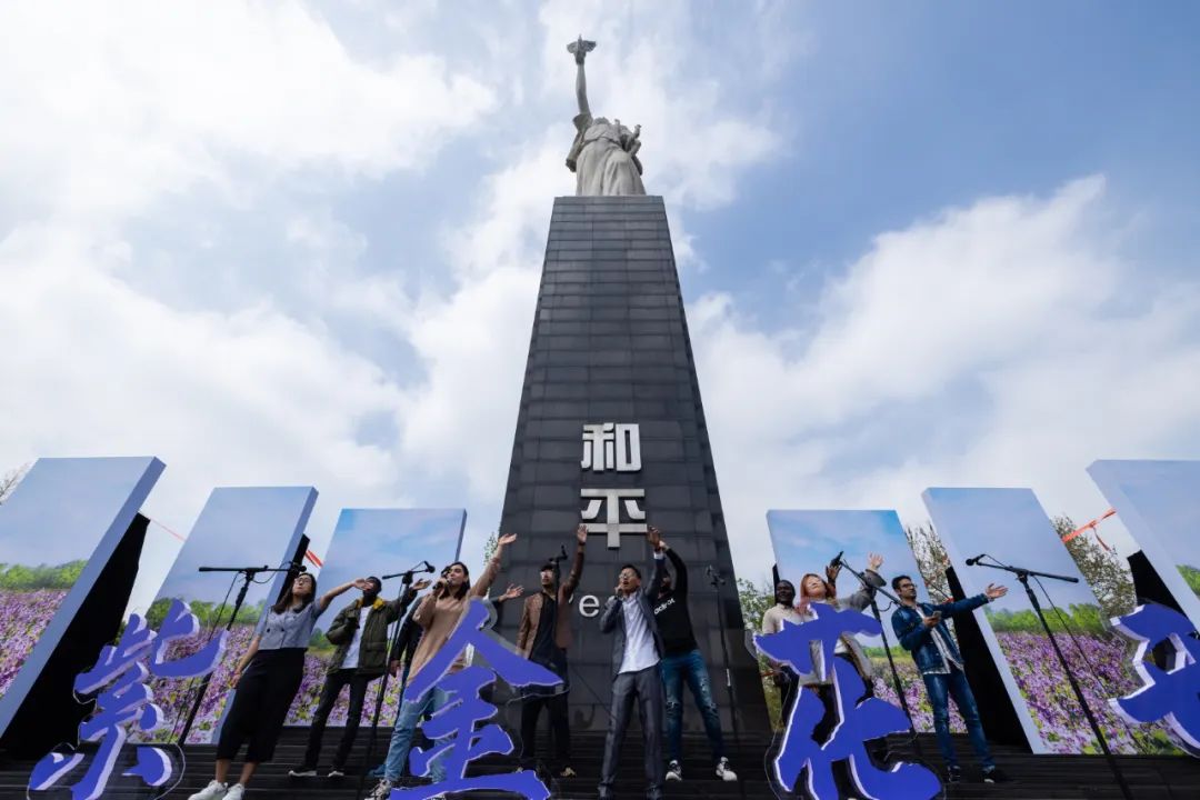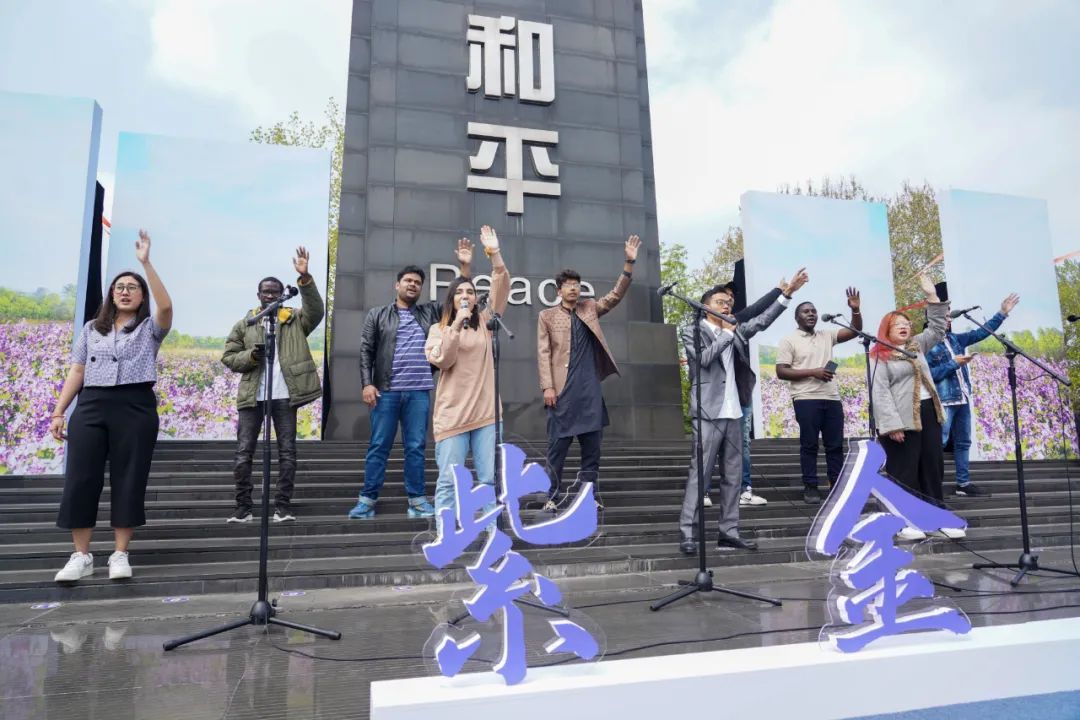 4月1日的纪念馆和平广场,微风拂面、碧空如洗,紫金草花园旁回荡着动感欢快、青春洋溢的歌声,不同国籍、不同肤色的紫金草志愿者们共聚和平女神雕像下,传递着他们的热情与奉献精神。