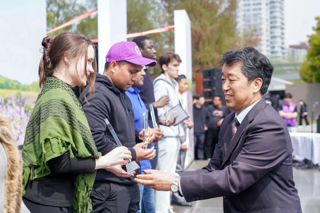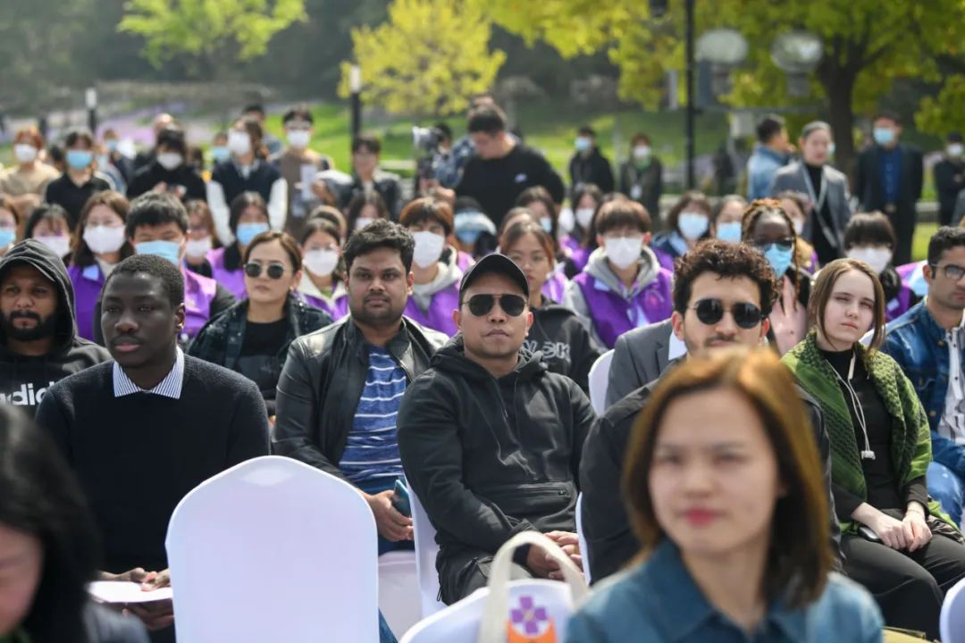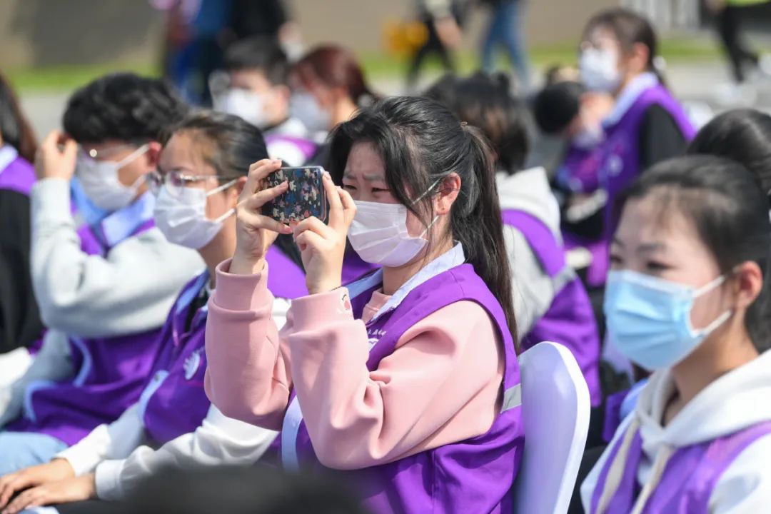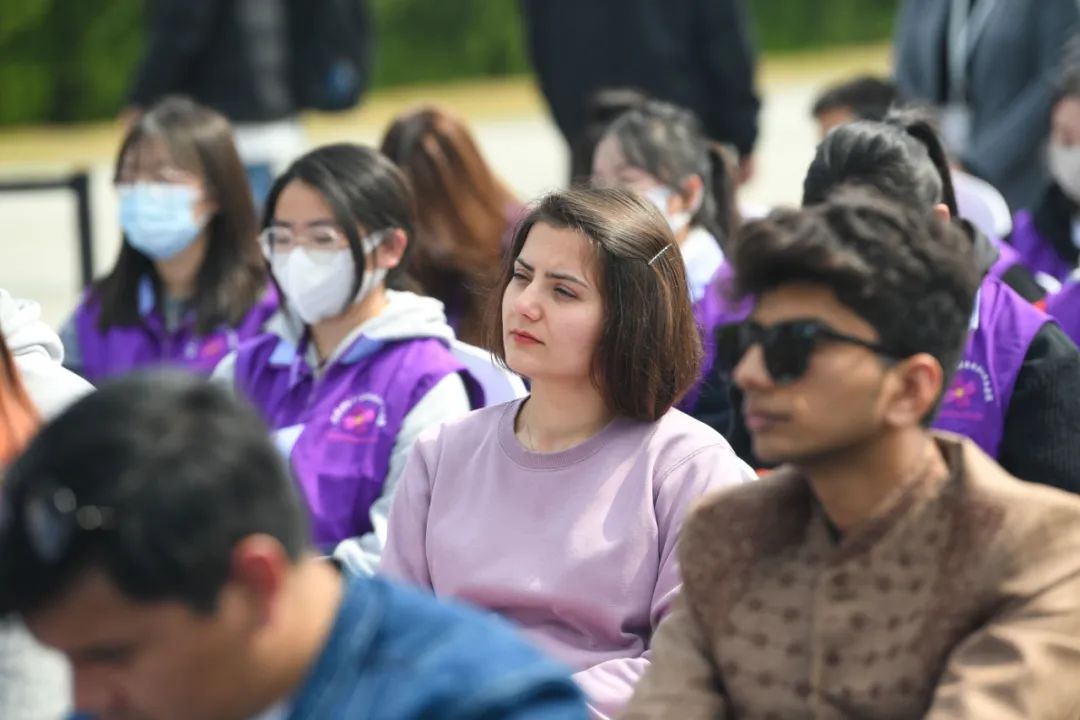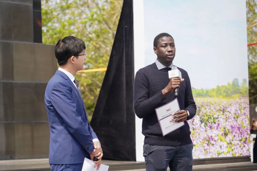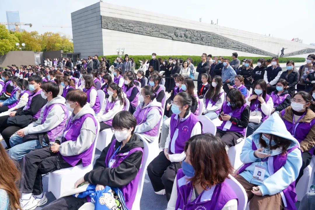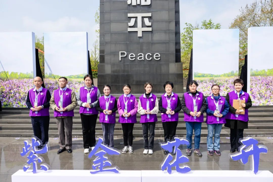 4月1日的纪念馆和平广场,微风拂面、碧空如洗,紫金草花园旁回荡着动感欢快、青春洋溢的歌声,不同国籍、不同肤色的紫金草志愿者们共聚和平女神雕像下,传递着他们的热情与奉献精神。
