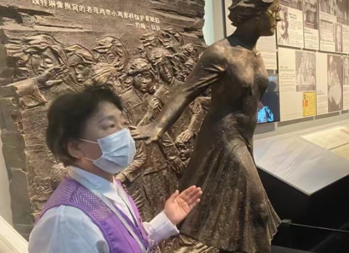 秦志红,“50后”,是抗战老战士秦华礼的女儿。秦华礼走过二万五千里长征,抗日战争时任八路军129师电台台长,跟随刘伯承师长转战太行山区。去年,秦志红成为纪念馆讲解志愿者。假期中,她带领观众朗诵《魏特琳日记》选段。