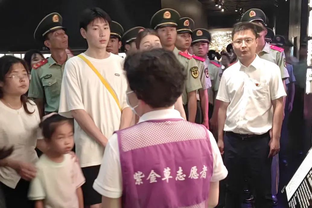 “您好,请准备好身份证”“您好,去客服中心沿着马路向前”……暑期,纪念馆再次迎来参观高峰。烈日下,身穿紫色马甲的志愿者们毫无怨言地与场馆工作人员并肩服务在一线。