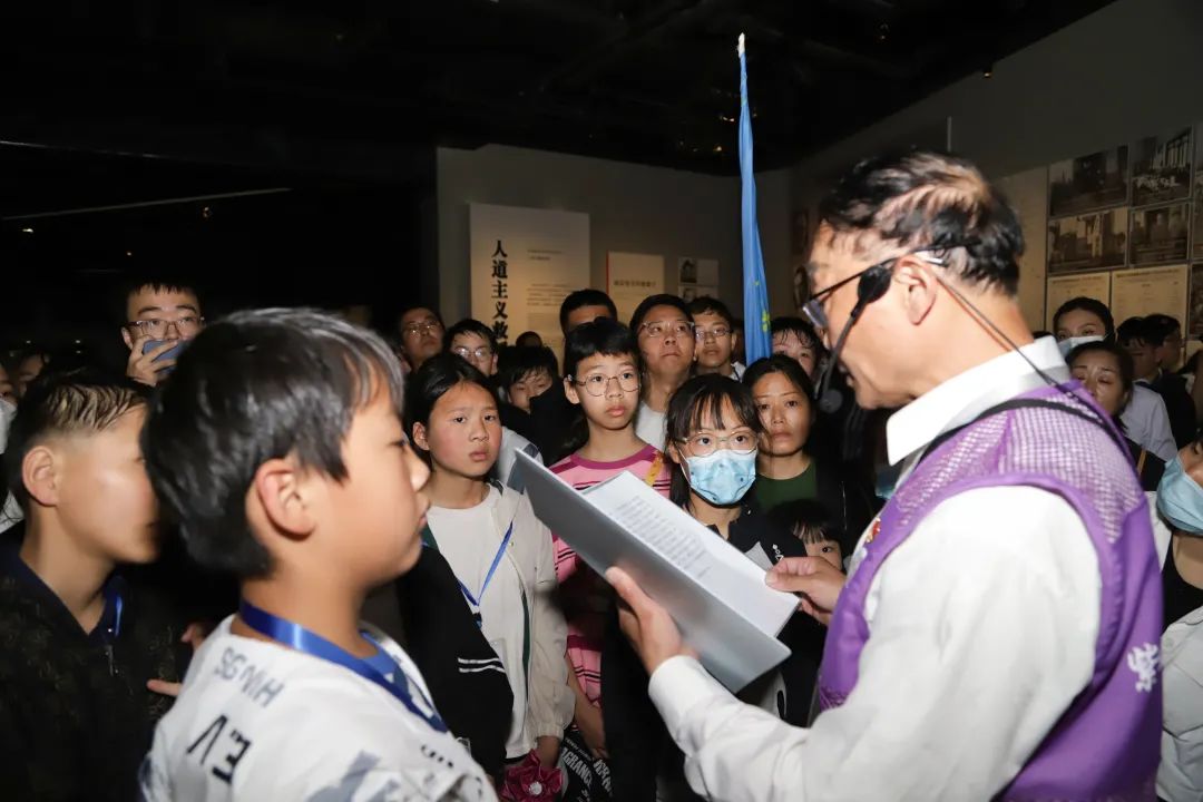 傅云生也从幕后走向台前,每年节假日是纪念馆最忙的时候,他从未因为自己年长而缺席,他穿梭在排队参观的人群中,维持秩序、解答问题,并为观众进行场馆讲解。多年的教师生涯让傅云生对前来参观的孩子格外关注,每当看到家长带着孩子时,他都会上前进行一对一讲解。“做志愿者是在扩宽生命的宽度,希望让更多青少年了解这段不容忘却的历史。”