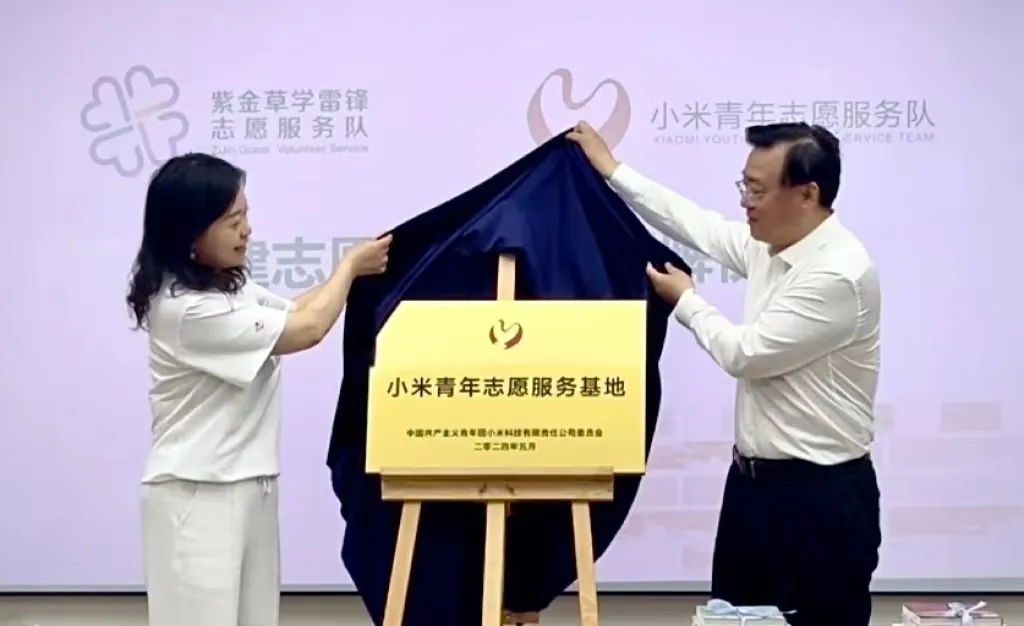 中共南京市委宣传部副部长、纪念馆馆长周峰与小米集团党委常务副书记、工会主席、妇工委主任施艳共同为小米青年志愿服务基地揭牌